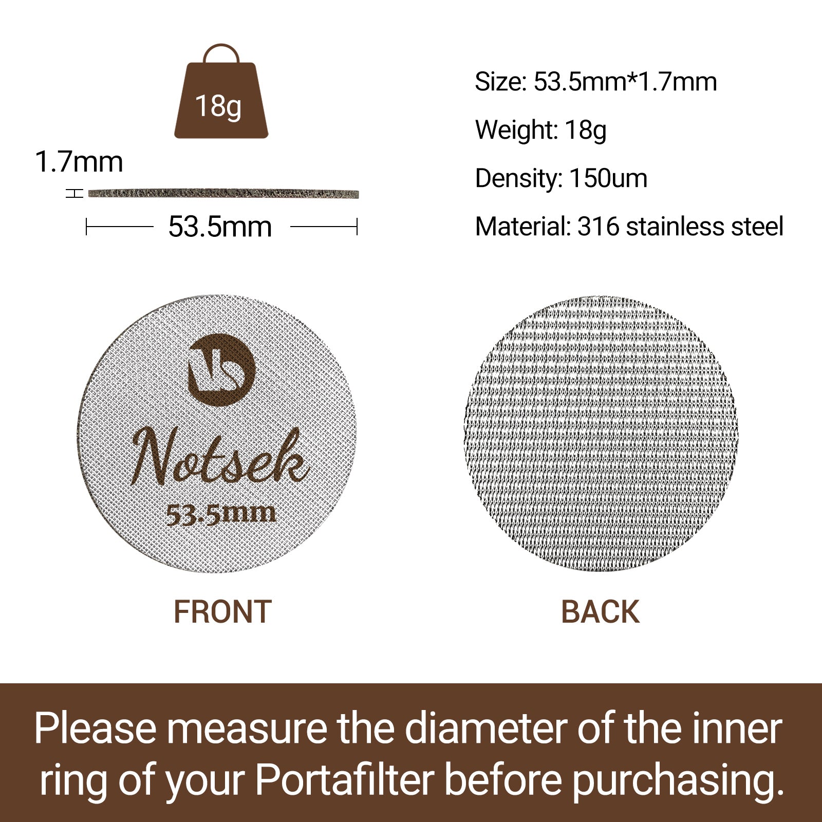 - Food Graded Material - Unlike other espresso mesh screen which bonded together using adhesive, our coffee puck screen 54 mm is made of multi-layer sintered 316L stainless steel which is better than 304 stainless steel and can be used sustainably at high temperatures.